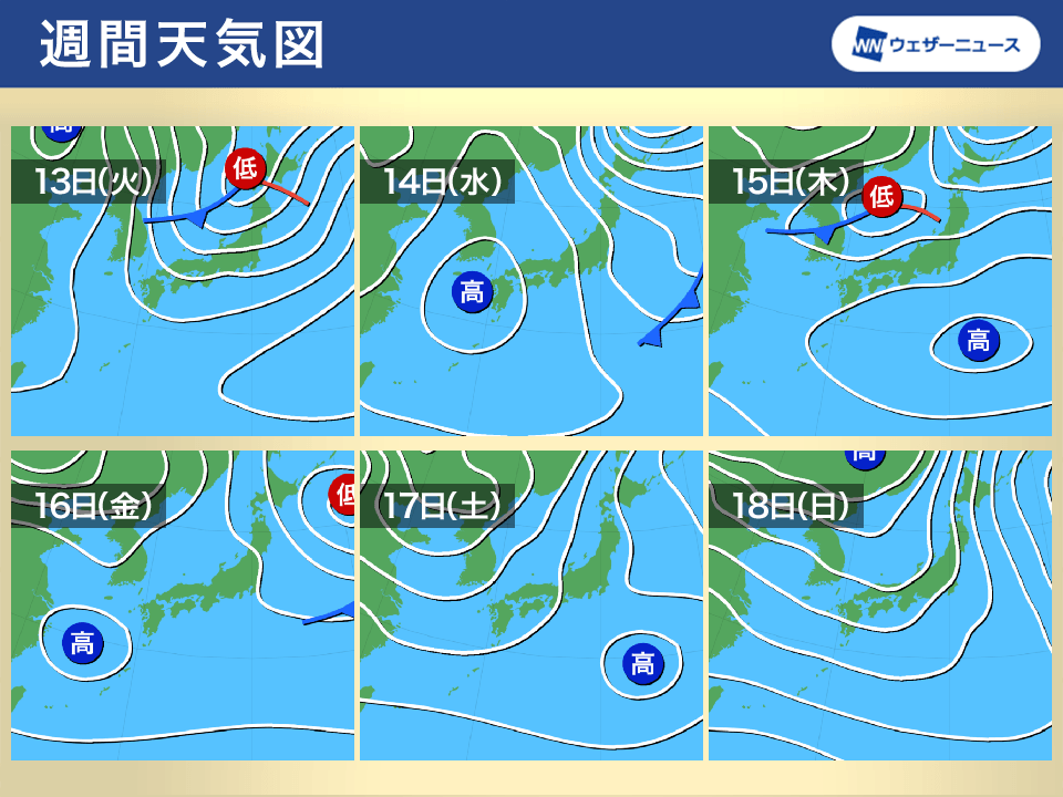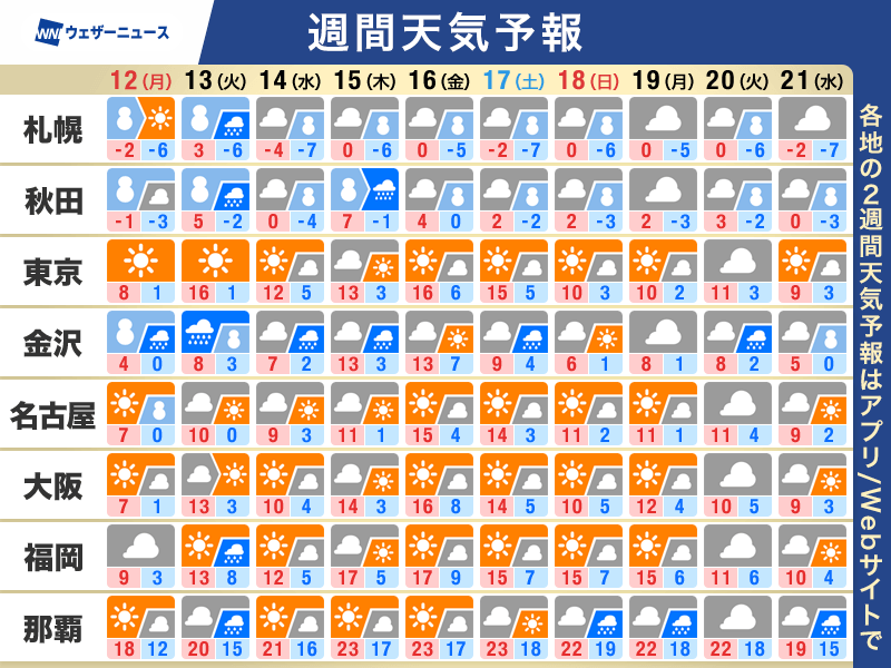 三連休明けの13日(火)は一旦寒さが緩むものの、14日(水)は北日本を中心に極寒となります。15日(木)以降は東日本や西日本を中心に、この時期としては気温が高めで推移しそうです。