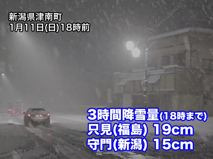 これから日付が変わる頃まで北陸や関東甲信北部、東北南部では局地的に1時間に5〜10cmの激しい雪の降るおそれがあります。