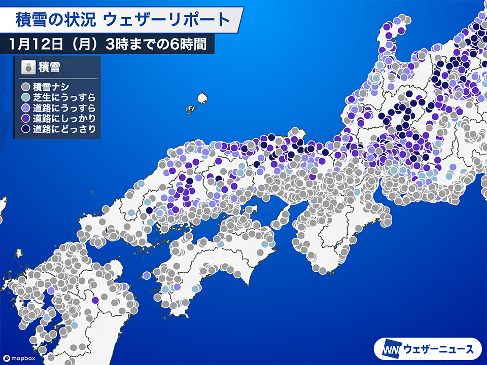 このほかにも、濃尾平野周辺や瀬戸内など普段雪の少ない地域でも積雪があるとの報告が、ウェザーニュースアプリの「ウェザーリポート」でたくさん寄せられています。