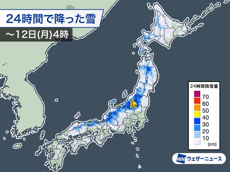 また、発達した雪雲は日本海側に留まらず、4時の積雪深(雪の厚み)は岐阜市で11cm、名古屋市で1cm、仙台市で2cmを記録しています。