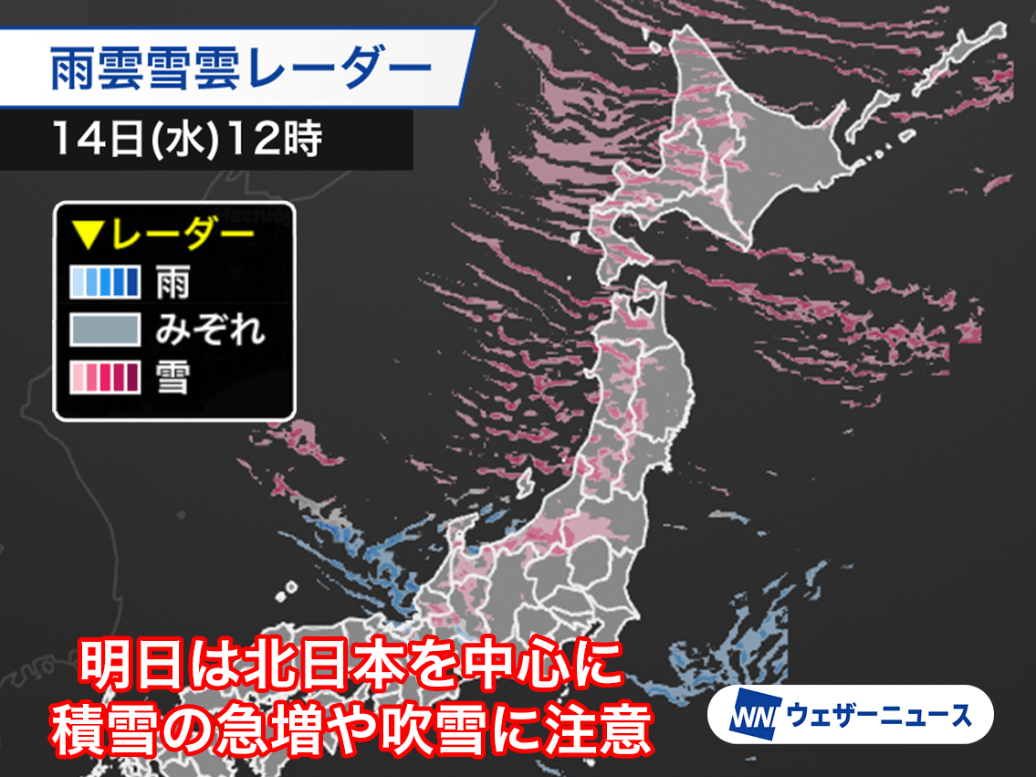 15日(木)は冬型の気圧配置が緩むものの、次の低気圧が北日本を通過します。北日本を中心に、強風や雪・雨に注意してください。