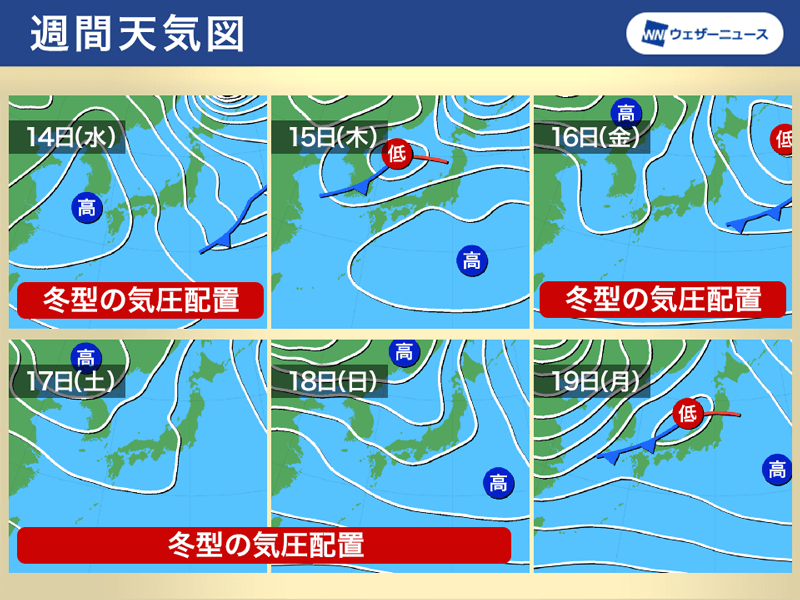 16日(金)から週末にかけては冬型の気圧配置の日が続き、週末には冬型が強まる可能性があります。