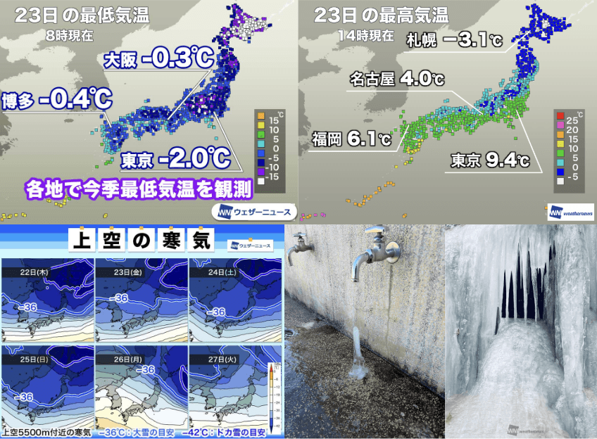 この冬最強の寒気によって全国的に気温が平年より低い状況が続きました。例えば1月23日(金)は朝の冷え込みが強く都市部でも氷点下となりました。