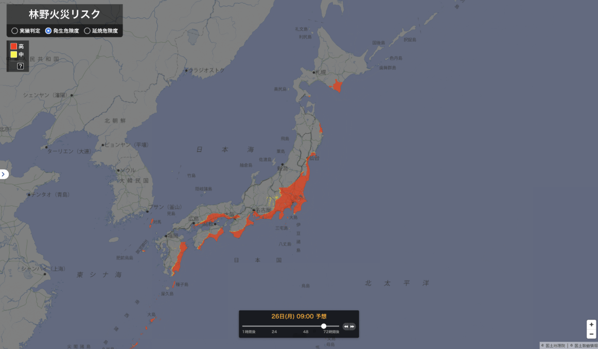 ウェザーニュース for businessの「林野火災リスク」(※2)では、2026年1月に施行された条例に定められる林野火災注意報・警報について、総務省消防庁の示す発令指標の設定例に基づき、発令条件に合致するか全国のアメダス地点について判定します。また、72時間先までの発生危険度および延焼危険度をご提供しています。