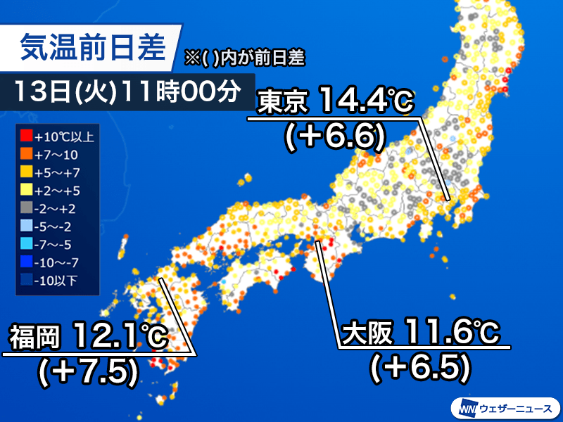今日13日(火)11時の気温は、福岡は昨日の同じ時刻より7.5℃高い12.1℃、大阪は6.5℃高い11.6℃、東京は6.6℃高い14.4℃となっています。九州から関東にかけては昨日よりかなり気温が高くなっています。午後も気温は高めに推移します。