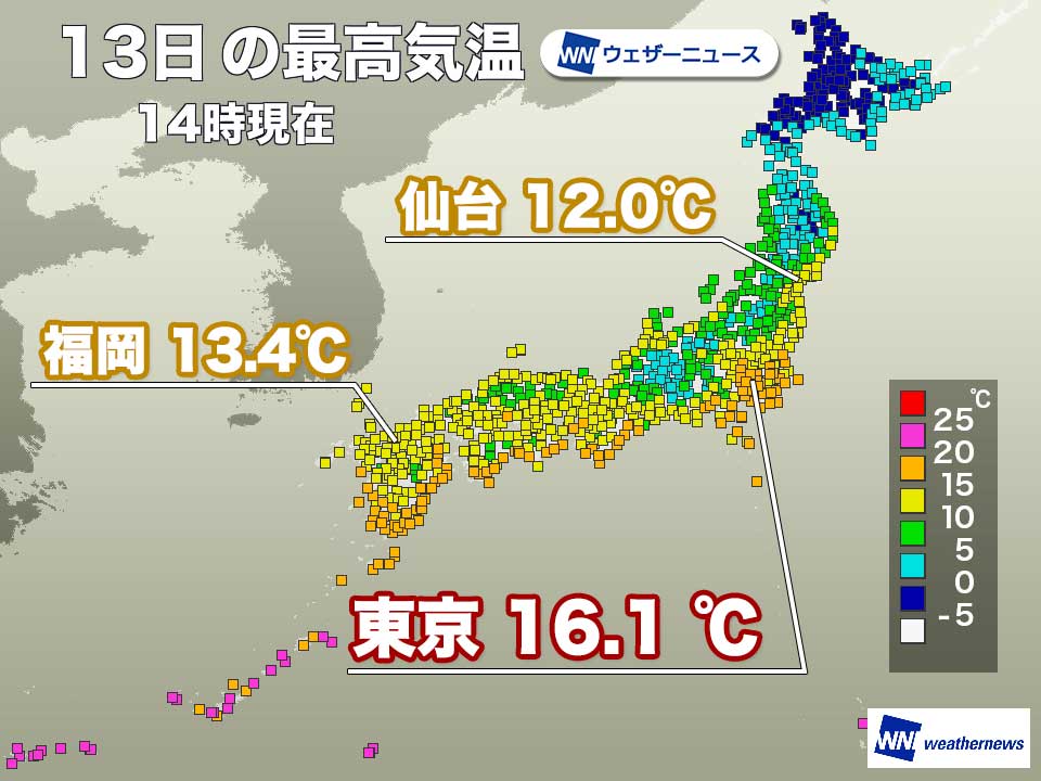 今日13日(火)14時までの最高気温は、福岡は13.4℃、広島14.9℃、大阪は12.9℃、東京16.1℃となっています。東京都心で16℃台まで上がるなど、西日本や関東は昨日よりかなり気温が高くなっています。風が強めに吹いたものの、寒さは控えめでした。今朝は-4.2℃まで冷え込んだ水戸は14時までに15.4℃を観測しました。