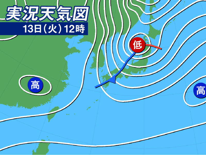 今日は低気圧が発達しながら日本海を北東に進み、低気圧からのびる寒冷前線が日本列島を通過しています。
