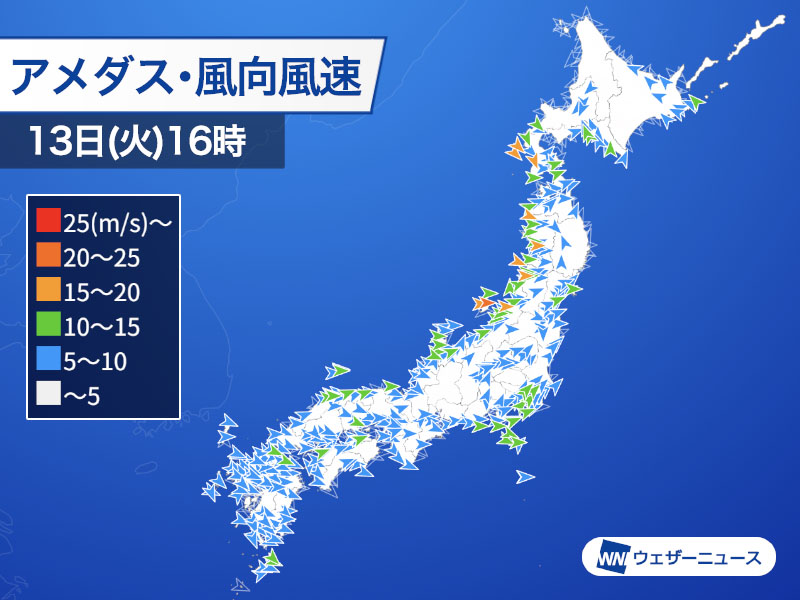 晴れている関東も東京湾周辺で南西風が強まっています。東京都江戸川臨海では13時25分に最大瞬間風速25.8m/sの強い風を観測しました。関東では夕方まで最大瞬間風速20m/sを超える強風に注意が必要です。