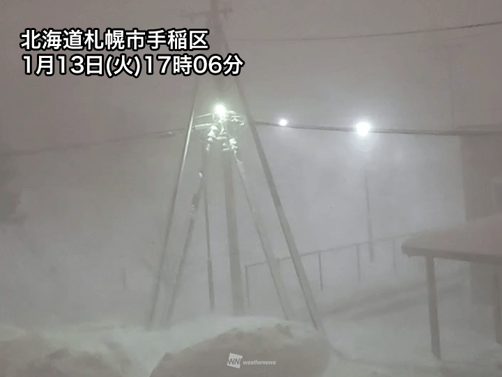 17時15分の時点で北海道の各地に暴風雪警報が発表中です。積雪の急増による路面状態の悪化や、吹雪による視界不良が想定されますので、車の運転などは無理をせず、ピークを過ぎるまで警戒を続けてください。