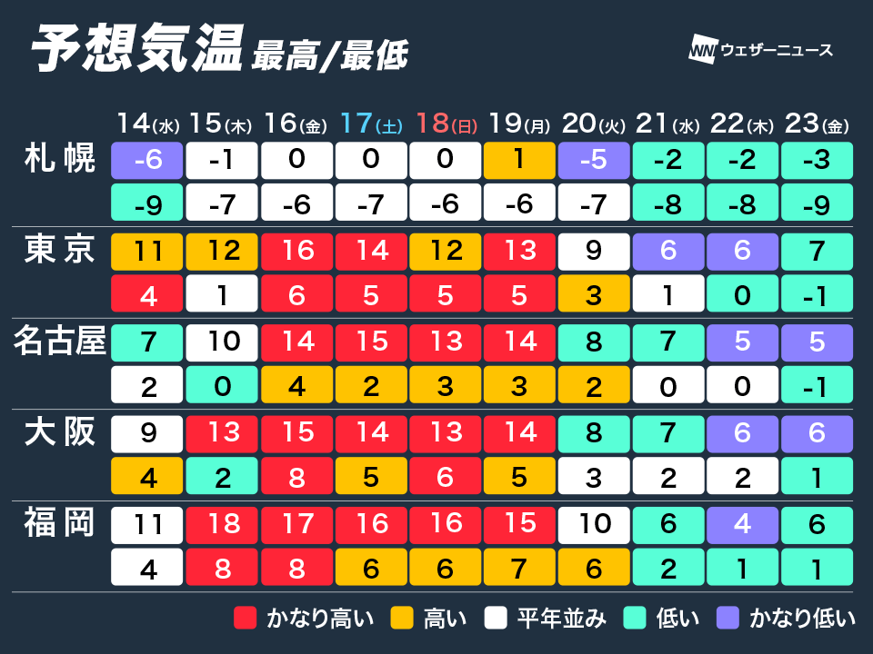 各地の予想気温をみると、関東から西日本にかけては明日14日(水)は寒くなりますが、明後日15日(木)からは平年よりも高い日が多くなります。
