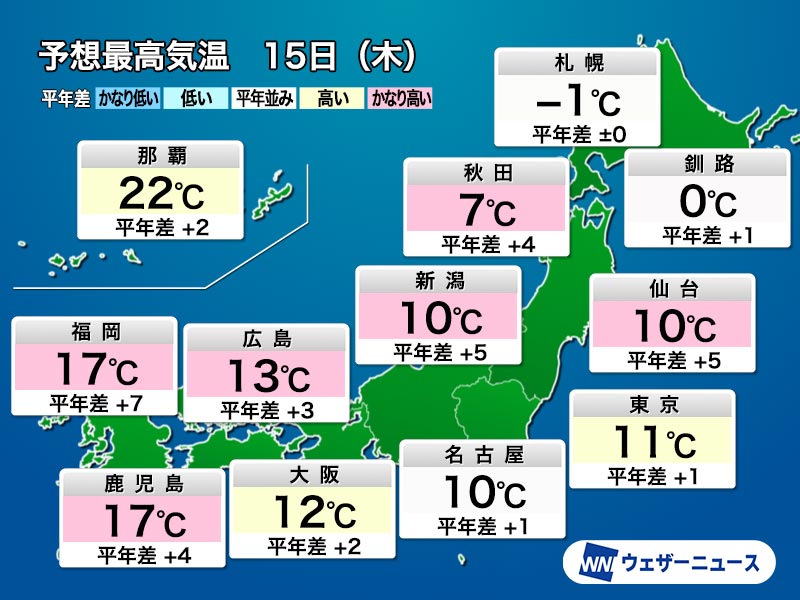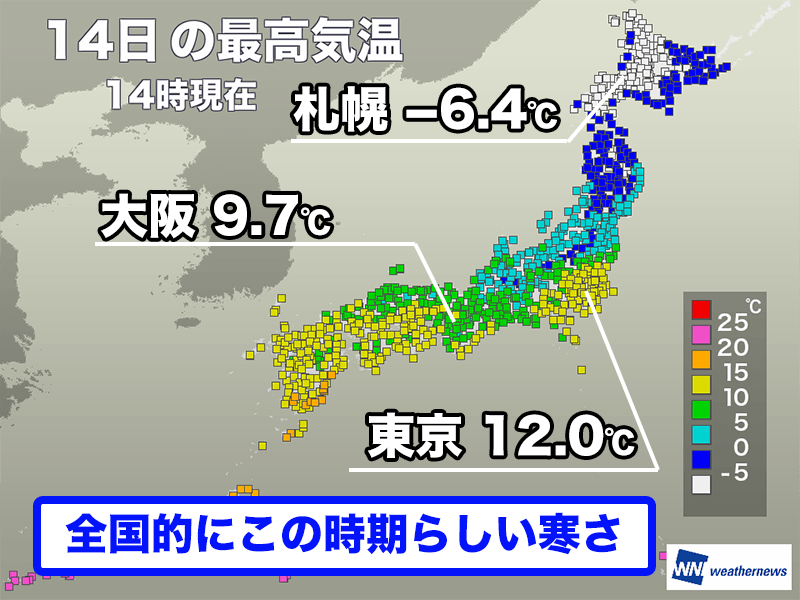 今日14日(水)14時までの最高気温は、福岡11.4℃、大阪9.7℃、名古屋7.4℃、東京12.0℃でした。冬型の気圧配置となり、西日本や東日本は昨日より気温が低めです。昼間も季節風が冷たく感じられました。