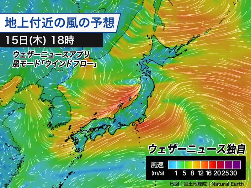 また、低気圧や前線の周辺では風が強くなります。天気の崩れが小さい関東も、午後は沿岸部で南西風が強くなるため注意が必要です。