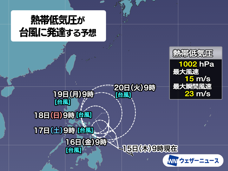 この後はしばらく北西に進みながら発達し、16日(金)の朝までには台風になるとみられます。18日(日)以降は進路を北から東寄りに変えて、あまり北上はしない見込みです。