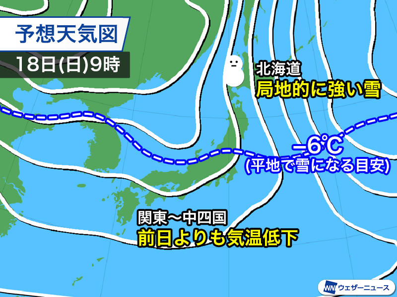 18日(日)は北日本を中心に冬型の気圧配置となるため、日本海側では雪の降る所が多くなります。