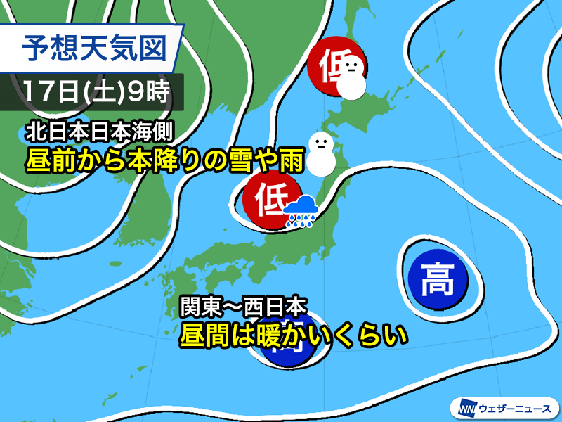 17日(土)は低気圧が日本海を進みます。北日本の日本海側と北陸の一部では朝から雪や雨の降る所がある見込みです。本格的に降り出すのは昼近くなってからで、朝の移動時間帯は強まる所は多くない予想となっています。