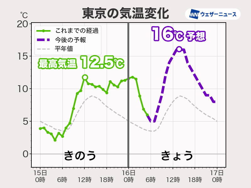昼間は広い範囲で15℃を上回る予想です。九州や四国では20℃前後まで上がる所もあり、日差しの下では上着なしでも過ごせるくらいになります。