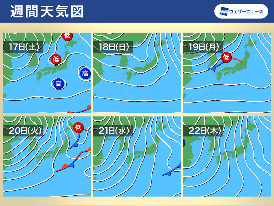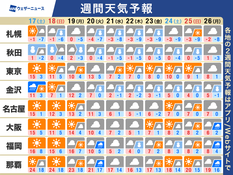 週明け19日(月)にかけて、北海道や東北北部では冬らしい寒さの日が多くなる一方、東北南部や東日本、西日本では季節を先取りした暖かさとなる予想です。