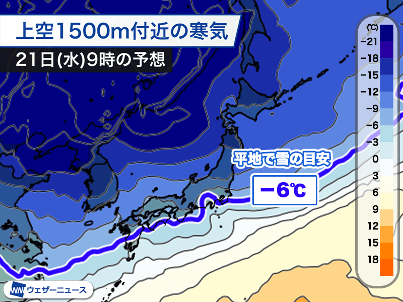 20日(火)の大寒の頃から日本付近は冬型の気圧配置となり、段々と寒気が強まる見通しです。強い寒気の南下によって、日本海側では雪の強まりや大雪、吹雪に注意が必要です。