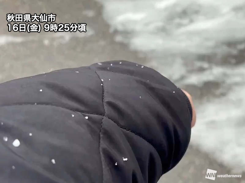 寒気はあまり強くなく、平地で雪を降らせる目安の上空1500m付近で−6℃のラインは東北北部付近にあります。このため、東北も平地は南部を中心に雨、山沿いは湿った雪の所が多くなっています。局地的に雲が発達し、山形県小国町では8時00分までの1時間に15.0mmの雨を観測しました。霰(あられ)が降っている所もあります。