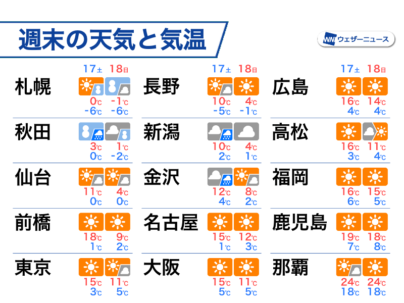 関東から西日本の各地は晴れの一日です。朝は少し冷え込むものの、昼間は気温が上がって季節先取りの暖かさになります。体感変化が大きくなるため、服装選びに注意が必要です。