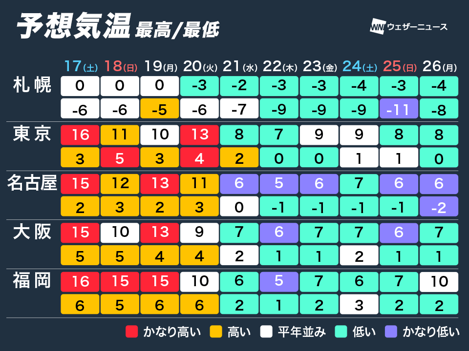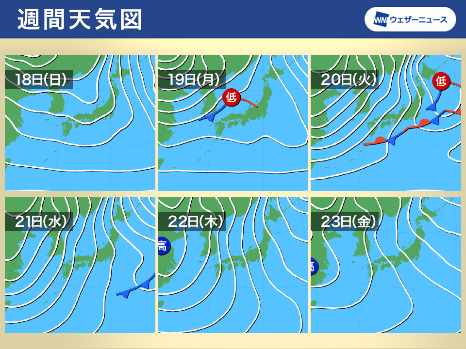 週明け19日(月)にかけて、北海道や東北北部では冬らしい寒さの日が多くなる一方、東北南部や東日本、西日本では季節を先取りした暖かさとなる予想です。