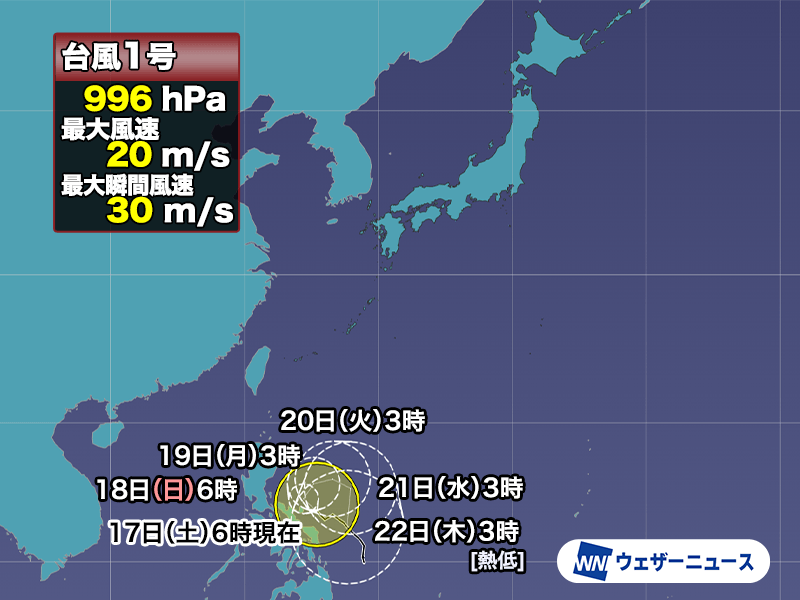 台風1号は明日18日(日)にかけて北西に進み、フィリピンに接近します。その後は速度を落としてほとんど停滞し、21日(日)頃には進路を南寄りに変える予想です。