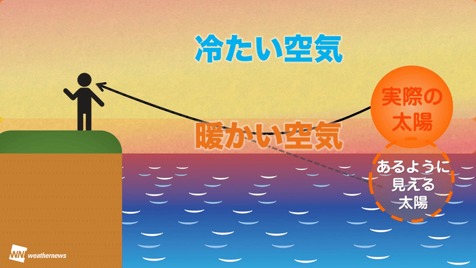 空気と水を比較すると、空気は熱されやすく冷めやすい、水は熱されにくく冷めにくい性質があります。そのため、気温差の大きい秋や冬の朝夕には、冷えやすい空気と冷えにくい海水の温度差で「だるま朝日」を見られることが多くなります。