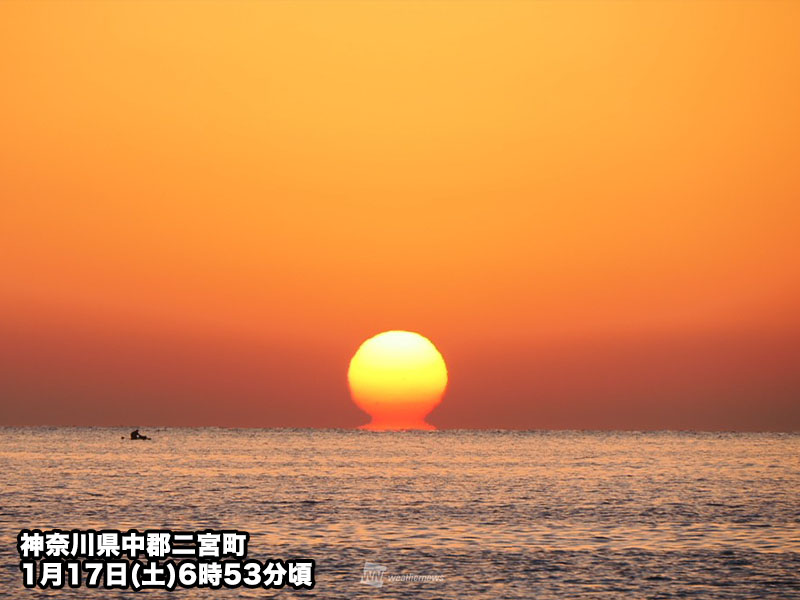 神奈川県小田原市では、今朝は1.6℃まで冷え込みました。一方で神奈川県周辺の海面水温は15前後となっていたため、この温度差によって太陽の光が屈折してだるま朝日が見られたと考えられます。
