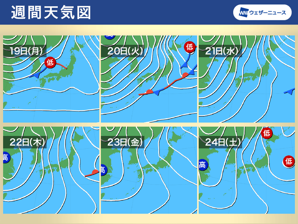 週明けまでは同じような状況が続く見込みで、関東から西日本の最高気温は平年より高めの所が多い予想です。