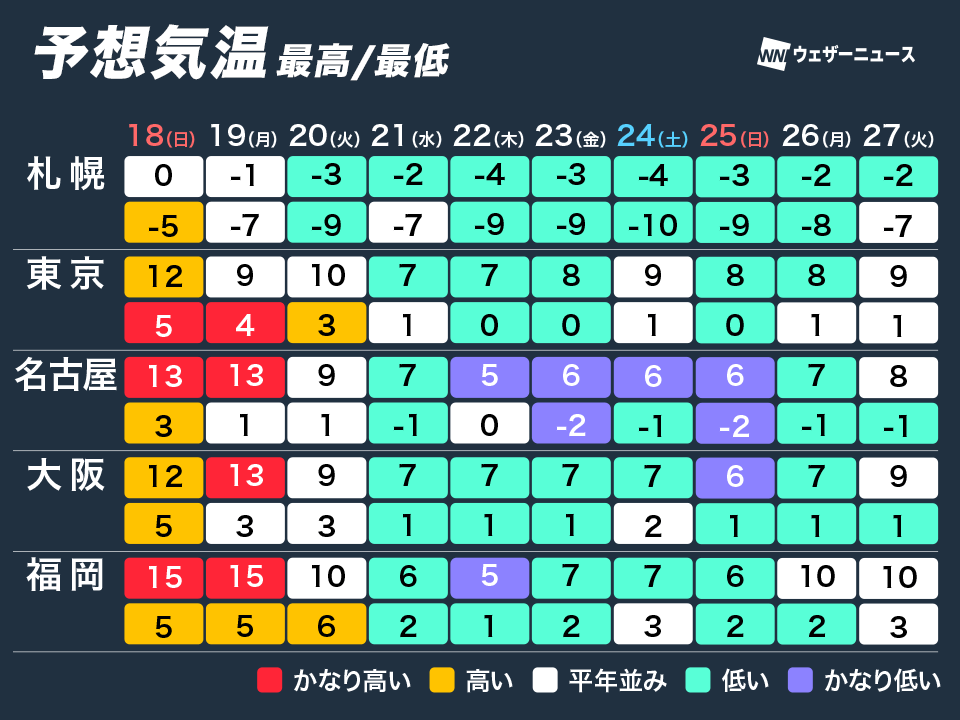 北日本はさらに寒く、札幌市では最高気温が−3℃前後、最低気温が−10℃前後の日が続く予想です。
