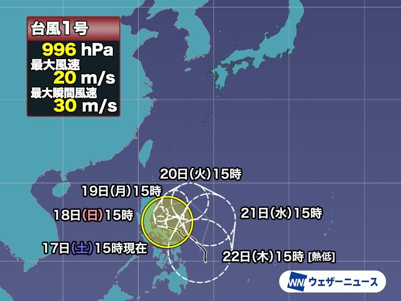 台風1号は明日18日(日)にかけて北西に進み、フィリピンのルソン島に接近します。その後は速度を落としてルソン島の東を時計回りに進み、21日(水)頃には進路を南寄りに変える見通しです。