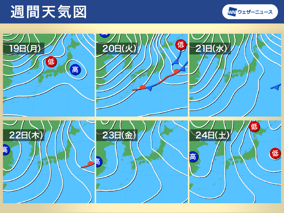 明日19日(月)夜に低気圧が東北北部を通過し、北日本を中心に天気が下り坂となります。20日(火)には冬型の気圧配置となって、日本付近に寒気が流れ込み始めます。