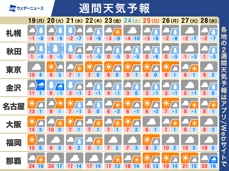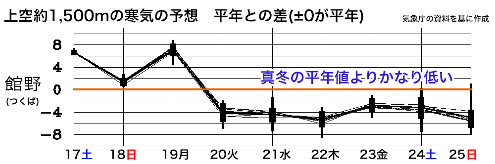東日本や西日本では明日19日(月)にかけては気温が高めの状況が続きます。一方、寒気の南下が始まる20日(火)以降は全国的に気温が平年より低くなり、この状況が1週間程度続く予想となっています。もともと一年で最も寒い時期ですが、その最も寒い時期の平年値を下回る気温の日が続くとみられます。