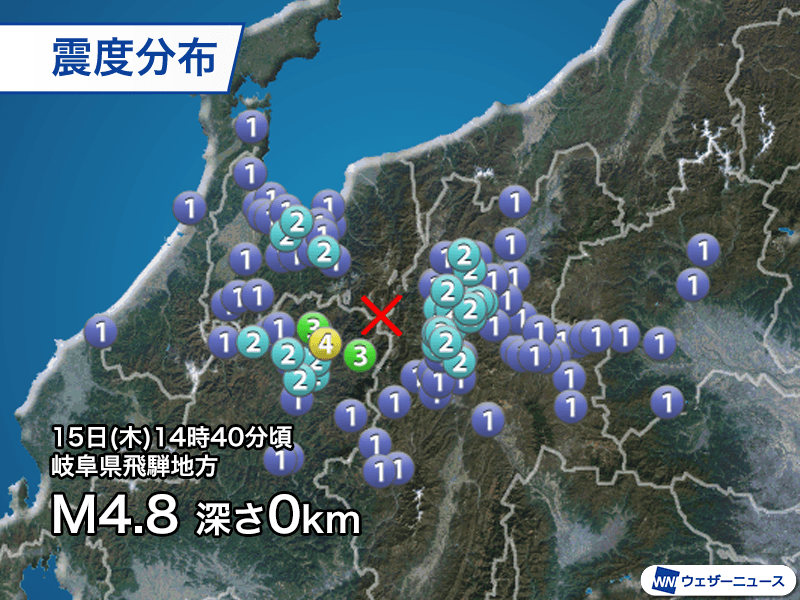 国内:岐阜県飛騨地方で震度4と震度3が続けて発生