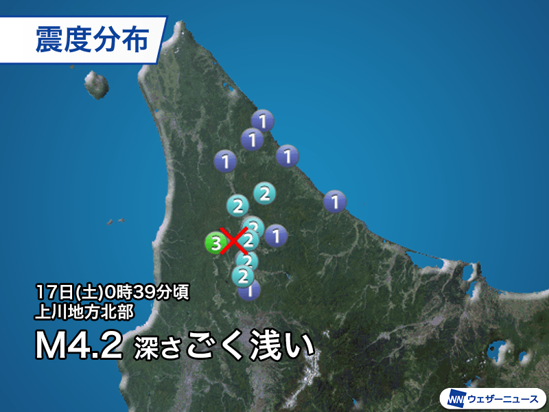17日(土)0時39分頃、北海道上川地方北部を震源とするマグニチュード4.2、深さはごく浅いと推定される地震が発生しました。この地震で北海道幌加内町で最大震度3、名寄市、士別市などで震度2を観測しています。