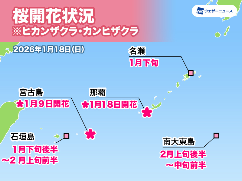 ウェザーニュースアプリに投稿される写真「ウェザーリポート」を見ていると、沖縄本島ではここ数日、ヒカンザクラの開花が進んでいるというウェザーリポートが目立ち始めていました。今日18日(日)は沖縄気象台が観測している那覇市首里末吉町の桜でも開花の定義を満たし、さくら開花の発表となりました。