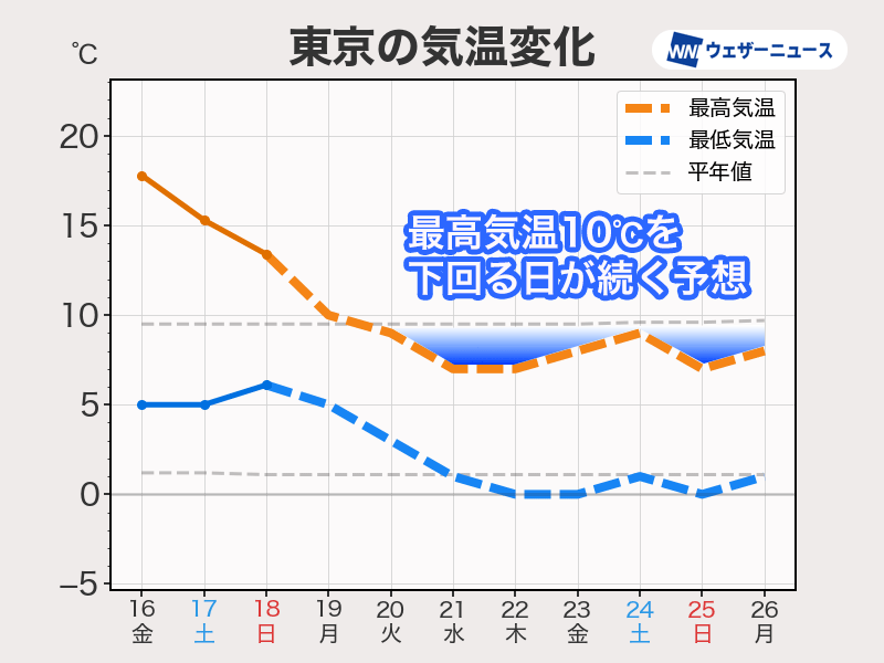 寒気の南下が始まる20日(火)以降は全国的に気温が平年より低くなり、この状況が1週間程度続く予想です。