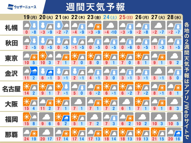 また、24日(土)〜25日(日)頃をピークに再び強い寒気が流れ込むおそれがあります。一連の寒波の二度目のピークとなる見通しです。
