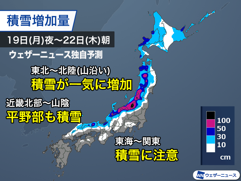 19日(月)夜から22日(木)朝までの積雪増加量は、東北や北陸、関東甲信北部の山沿いの多い所で50cmを超え、局地的には100cm前後に達する予想です。