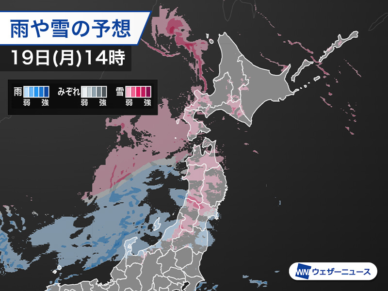 北日本の早い所では昼過ぎから雪や雨が降り出し、日本海側だけでなく太平洋側にも広がっていきます。