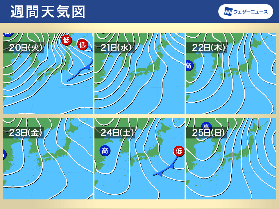 明日20日(火)は低気圧が急速に発達し、北日本などで荒れた天気となるおそれがあります。低気圧の発達に伴って冬型の気圧配置が強まり、21日(水)からは寒波のピークが始まる予想です。