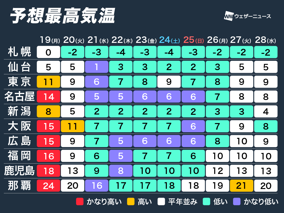 寒波のピークは明後日21日(水)から