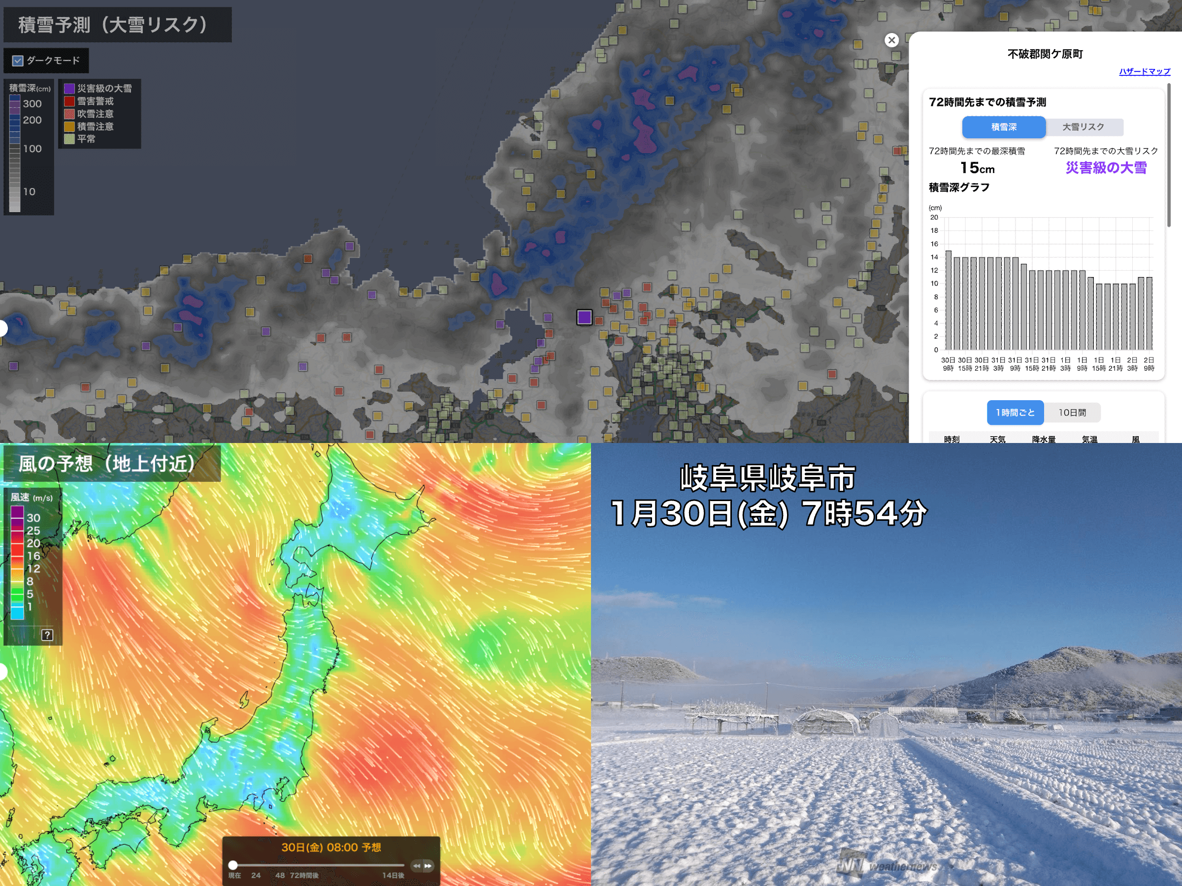 一方、太平洋側でも、29日(木)以降は寒気の影響が広がり、同日午後から翌30日にかけて、都内を含む関東南部や東海地方、京阪神でも雨や雪が降りました。関東南部ではまとまった雪とはならず、積雪はみられなかったのに対し、岐阜県や三重県北勢地域では夜間に雪雲が次々と流れ込み、積雪の報告も相次ぎました。