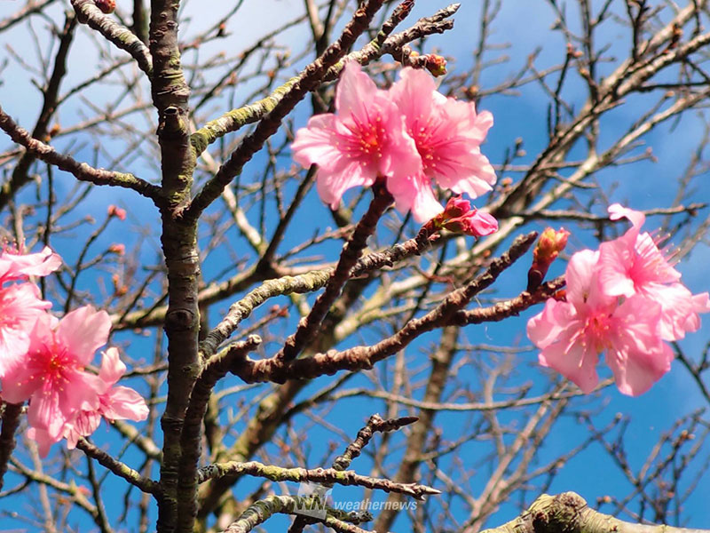 ソメイヨシノよりも濃いピンクの花を咲かせるヒカンザクラ(カンヒザクラ)。沖縄県民でなくとも、「桜開花」の報を見聞きすると、うれしくなりますね。