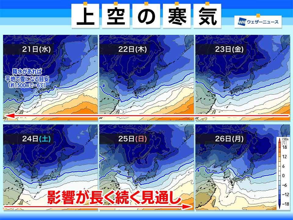 その後は週末の25日(日)頃まで寒気に覆われた状態が続く予想となっています。