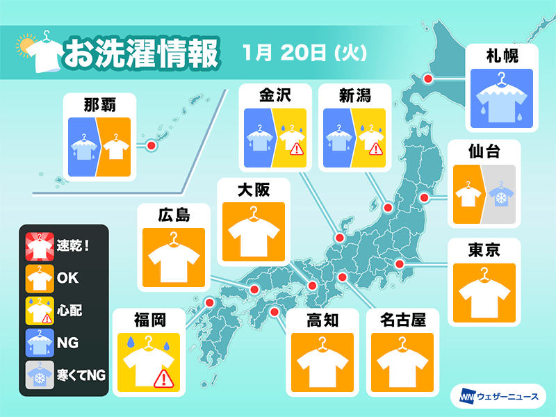 関東から九州にかけては雲の多いすっきりしない天気です。日差しが届いても、にわか雨や雪の可能性があるので外干しの際は空の変化に注意が必要です。