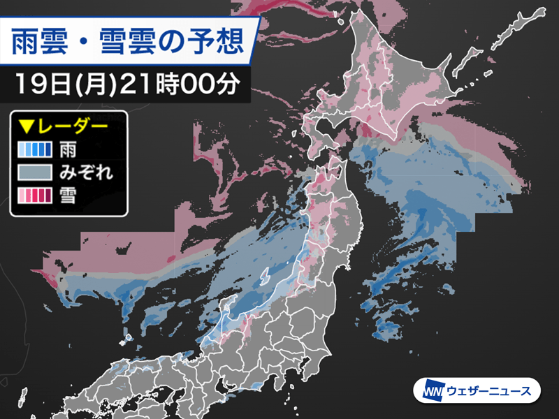 明日20日(火)は北日本各地で積雪急増や吹雪に注意が必要です。北陸でも今夜は次第に雨が雪に変わり、明日は平地でも雪の積もる可能性があります。