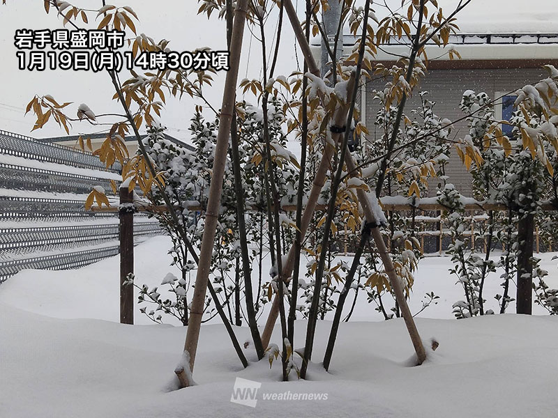 今日19日(月)は低気圧の接近に伴い、東北地方各地で雪や雨が降りました。15時までの6時間に、岩手県盛岡市で10cmの新たな雪が降っています。また、青森県十和田市で7cm、秋田県鹿角市で7cm、山形県最上町向町で6cmの6時間降雪量を観測しています。