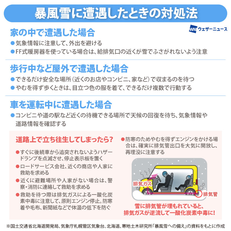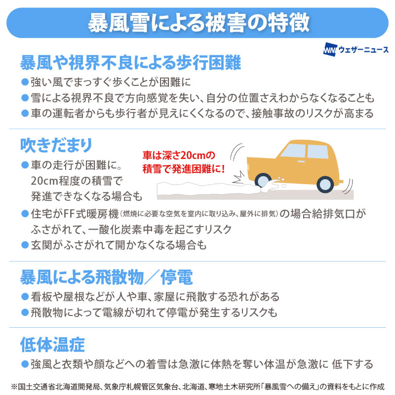 国土交通省北海道開発局・気象庁札幌管区気象台・北海道・寒地土木研究所「暴風雪への備え」、気象庁札幌管区気象台「暴風雪による人への影響」
