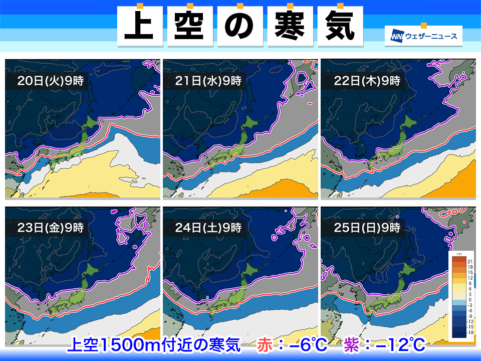 明日20日(火)には上空の強い寒気が日本列島の大部分を覆い、明後日21日(水)にかけてさらに南下する予想です。